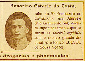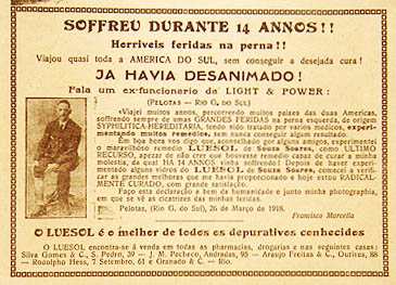 DURANTE 14 ANNOS!! Horriveis feridas na perna!! Viajou quasi toda a AMERICA DO SUL, sem conseguir a desejada cura! JA HAVIA DESANIMADO ! Fala um ex-funcionario da LIGHT & POWER : (PELOTAS - RIO G. DO SUL "Viajei muitos annos, percorrendo muitos paizes das duas Americas, soffrendo sempre de umas GRANDES FERIDAS na perna esquerda , de origem SYPHILITICA-HEREDITARIA, tendo sido tratado por varios medicos, experimentando muitos remedios, sem nunca conseguir nenhum resultado. Em boa hora vos digo que, aconselhado por alguns amigos, experimentei o maravilhoso remedio LUESOL de Souza Soares, como |