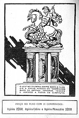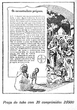 | Não sei o que houve em 1920/21 , mas em todos os números da revista Careta vinha um anúncio da Bayer alertando para os imitadores do seu produto "COMPRIMIDOS BAYER DE ASPIRINA". Repare no preconceito estampado na imagem que eles usaram e veja só o texto: |