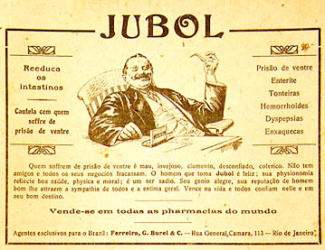 JUBOL Cautela com quem soffre de prisão de ventre Quem soffrem de prisão de ventre é mau, invejoso, ciumento, desconfiado, colerico. Não tem amigos e todos os seus negocios fracassam. O homem que toma Jubol é feliz ; sua physionomia reflecte boa saúde, physica e moral ; é um ser sadio. Seu genio alegre, sua reputação de homem bom lhe attraem a sympathia de todos e a estima geral. Vence na vida e todos confiam nelle e em seu bom destino. |